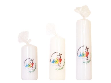 Symbolická svíčka Poutník naděje 2025 – čistý bílý design, dostupná ve třech velikostech: 120, 150 a 220 mm.