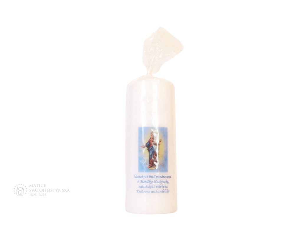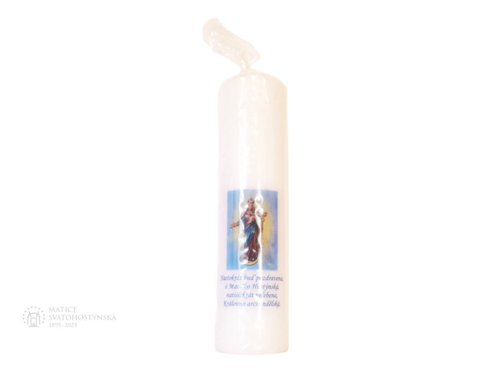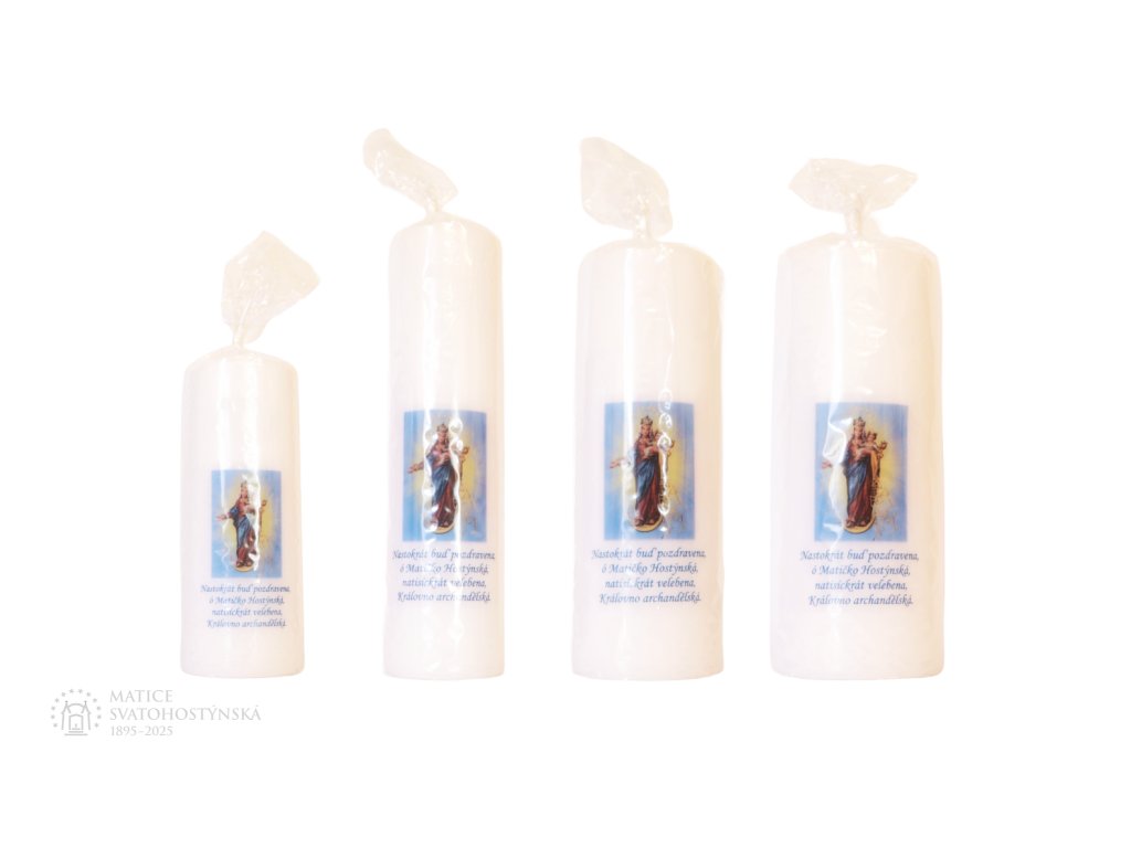 Svíčka s Pannou Marií Svatohostýnskou připomíná tradici, víru a modlitbu pod jejím posvátným obrazem.